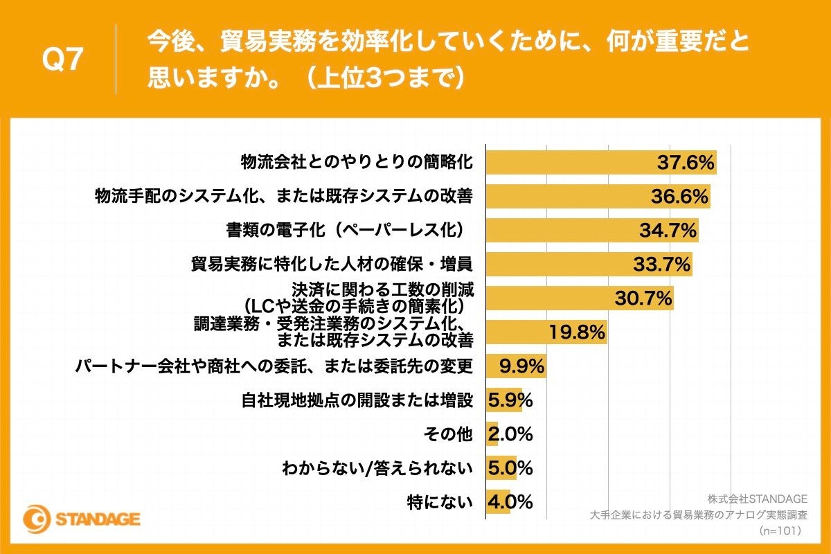 「Q7.今後、貿易実務を効率化していくために、何が重要だと思いますか。(上位3つまで)」(n=101)と質問したところ、「物流会社とのやりとりの簡略化」が37.6%、「物流手配のシステム化、または既存システムの改善」が36.6%、「書類の電子化(ペーパーレス化)」が34.7%という回答となりました。