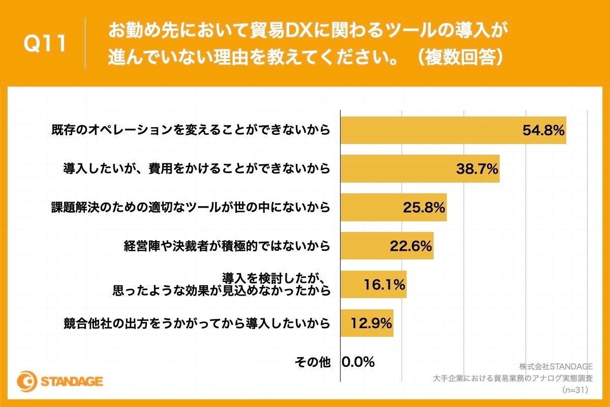 Q8で「いいえ」と回答した方に、「Q11.お勤め先において貿易DXに関わるツールの導入が進んでいない理由を教えてください。(複数回答)」(n=31)と質問したところ、「既存のオペレーションを変えることができないから」が54.8%、「導入したいが、費用をかけることができないから」が38.7%、「課題解決のための適切なツールが世の中にないから」が25.8%という回答となりました。