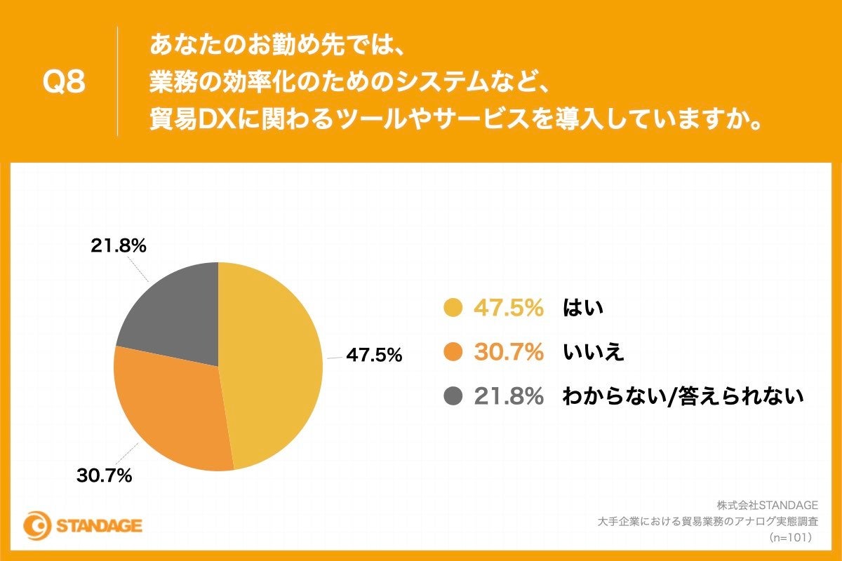 「Q8.あなたのお勤め先では、業務の効率化のためのシステムなど、貿易DXに関わるツールやサービスを導入していますか。」(n=101)と質問したところ、「はい」が47.5%、「いいえ」が30.7%という回答となりました。