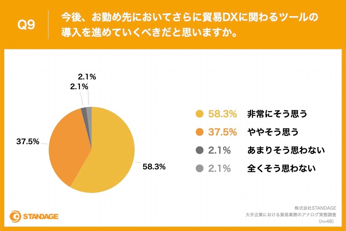 Q8で「はい」と回答した方に、「Q9.今後、お勤め先においてさらに貿易DXに関わるツールの導入を進めていくべきだと思いますか。」(n=48)と質問したところ、「非常にそう思う」が58.3%、「ややそう思う」が37.5%という回答となりました。