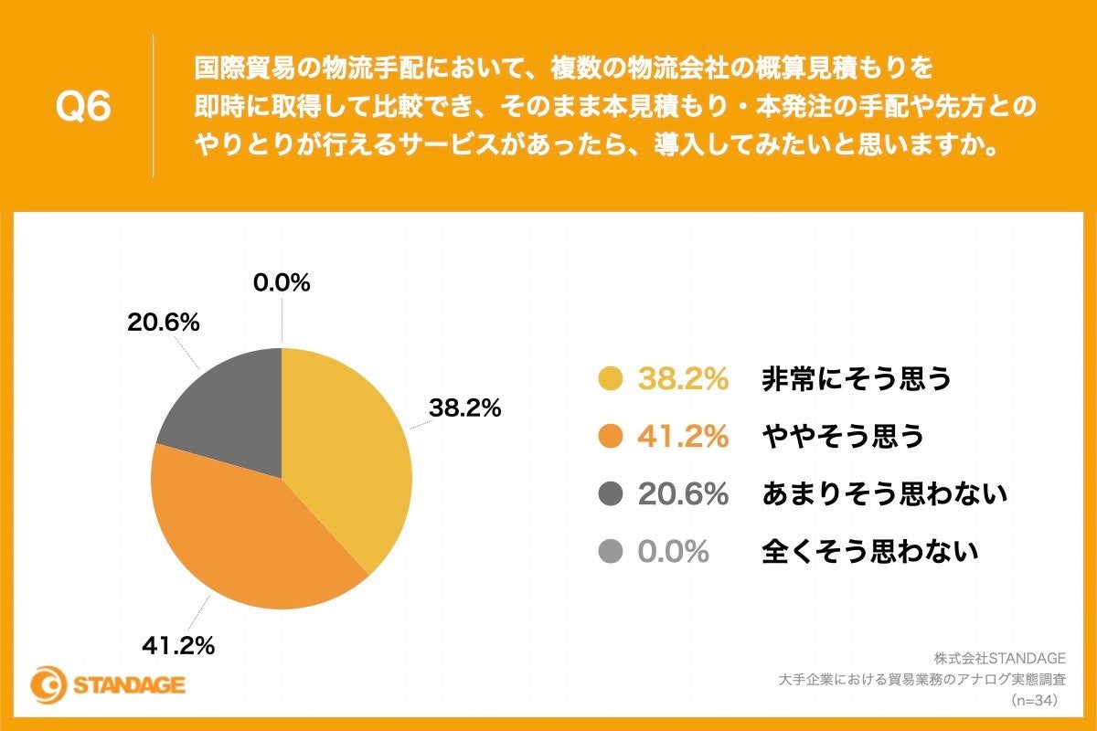 Q3で「物流手配や物流会社とのやり取りが煩雑で時間を取られる」と回答した方に、「Q6.国際貿易の物流手配において、複数の物流会社の概算見積もりを即時に取得して比較でき、そのまま本見積もり・本発注の手配や先方とのやりとりが行えるサービスがあったら、導入してみたいと思いますか。」(n=34)と質問したところ、「非常にそう思う」が38.2%、「ややそう思う」が41.2%という回答となりました。