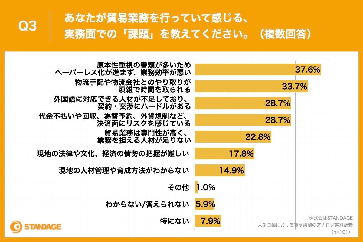 「Q3.あなたが貿易業務を行っていて感じる、実務面での「課題」を教えてください。(複数回答)」(n=101)と質問したところ、「原本性重視の書類が多いためペーパーレス化が進まず、業務効率が悪い」が37.6%、「物流手配や物流会社とのやり取りが煩雑で時間を取られる」が33.7%という回答となりました。