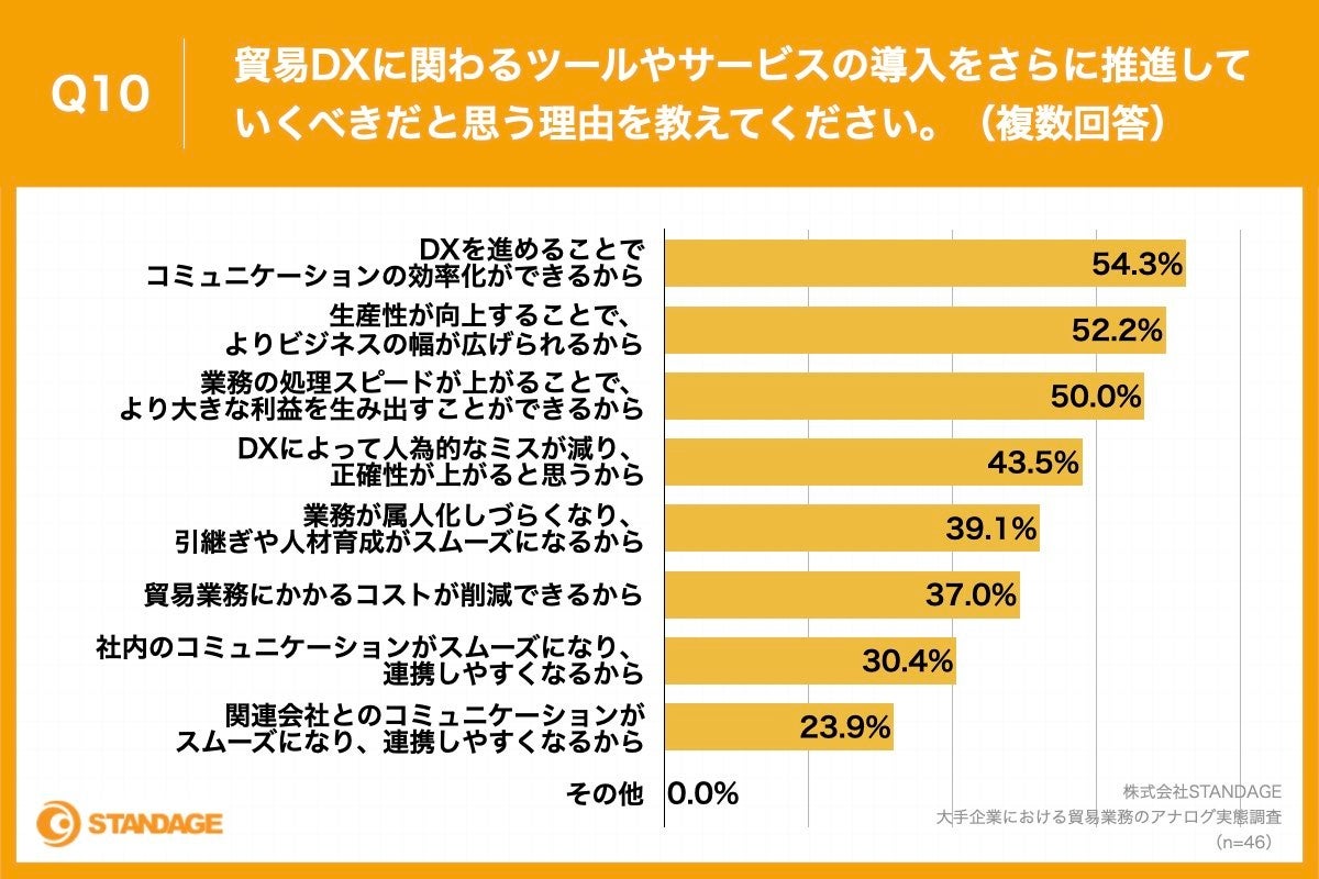 Q9で「非常にそう思う」「ややそう思う」と回答した方に、「Q10.貿易DXに関わるツールやサービスの導入をさらに推進していくべきだと思う理由を教えてください。(複数回答)」(n=46)と質問したところ、「DXを進めることでコミュニケーションの効率化ができるから」が54.3%、「生産性が向上することで、よりビジネスの幅が広げられるから」が52.2%、「業務の処理スピードが上がることで、より大きな利益を生み出すことができるから」が50.0%という回答となりました。