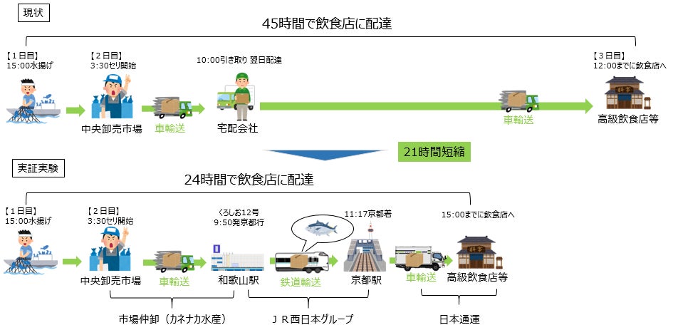 和歌山市が公共交通事業者(JR西日本グループ)と運送会社(日本通運株式会社)に連携を図り、各事業者が協力し、京都の飲食店に和歌山市中央卸売市場の新鮮な魚を当日配送する実証実験を行います。