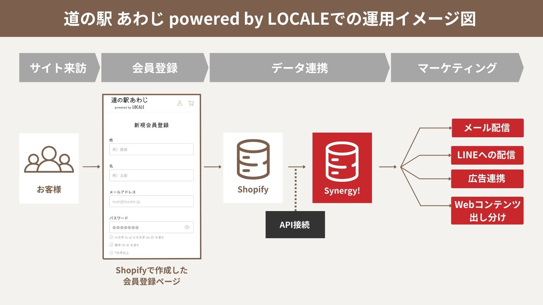 お客様がShopifyの会員登録ページにて入力した情報が自動的にCRMシステム 「Synergy!」に連携されます。既存のShopifyの会員登録ページで取得が可能な「姓名」「メールアドレス」「パスワード」に加え「生年月日」、「性別」、「居住地域」などより多くの顧客情報の取得・蓄積ができます。