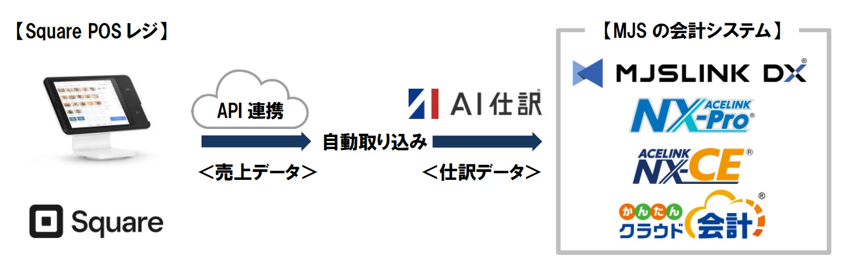 財務・会計システムおよび経営情報サービスを開発・販売する株式会社ミロク情報サービス(本社:東京都新宿区、代表取締役社長:是枝 周樹、以下「MJS」)は、幅広いコマースソリューションを統合したエコシステムの提供を行うSquare株式会社(本社:米国Block, Inc.、Block Head:ジャック・ドーシー、以下「Square」)が提供する『Square POSレジ』と、MJSの会計システム4製品、『MJSLINK DX(エムジェイエスリンク ディーエックス)財務大将』『ACELINK NX-Pro(エースリンク エヌエックスプロ)会計大将』『ACELINK NX-CE(エースリンク エヌエックス シーイー)会計』『かんたんクラウド会計』のオプション機能「AI仕訳」とのAPI連携を開始しました。