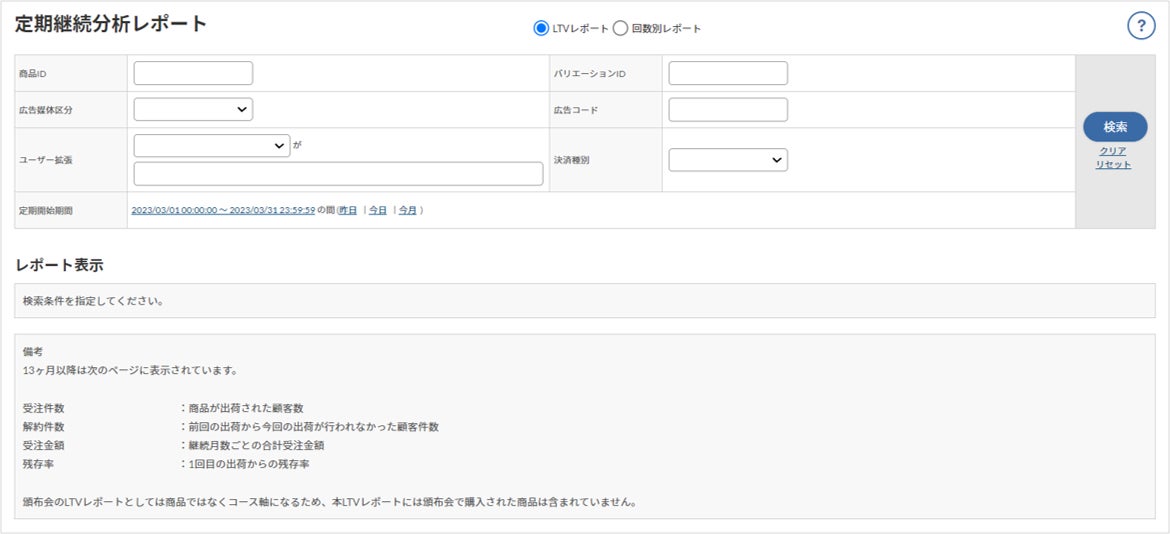 ・「定期継続分析レポート(LTVレポート)」は、以下の7項目から検索を行うことができます。