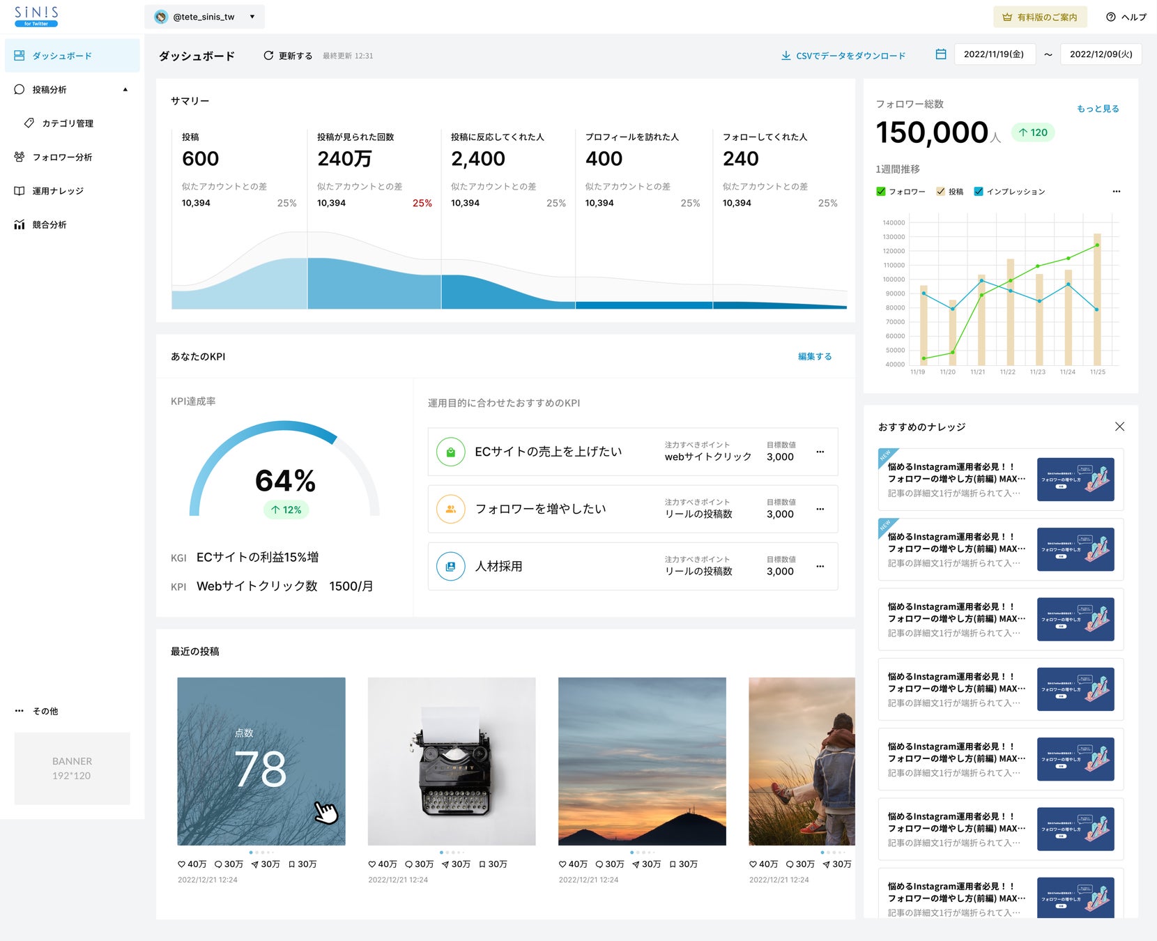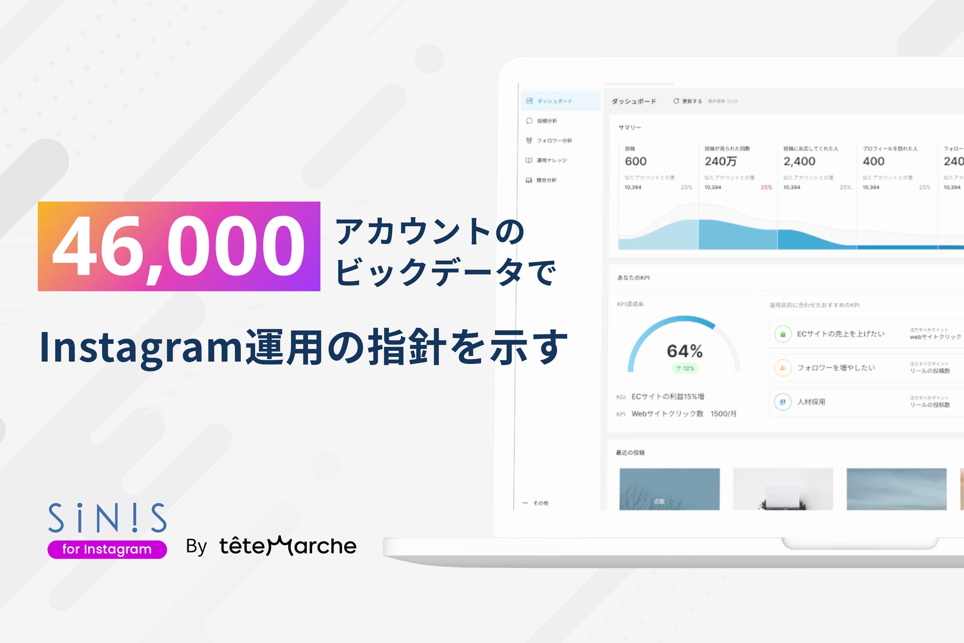 「SINIS DATA」とは、当社が提供するInstagram分析ツール「SINIS for Instagram」に登録している46,000件以上のアカウントに紐づくデータをもとに、アカウントの目標設計や日々の運用の指標となるデータを提供し、アカウント運用をサポートする「SINIS for Instagram」の新機能です。