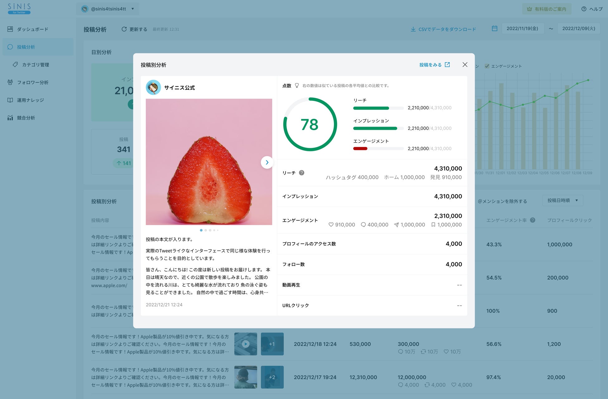 企業向け SNSマーケティング支援を中心としたビジネス展開をするテテマーチ株式会社(本社:目黒区、代表取締役:上田 大介)が運営するInstagram分析ツール「SINIS for Instagram(サイニス フォー インスタグラム)」は、新機能「SINIS DATA(サイニス データ)」β版利用登録の募集を2023年3月23日より開始します。
