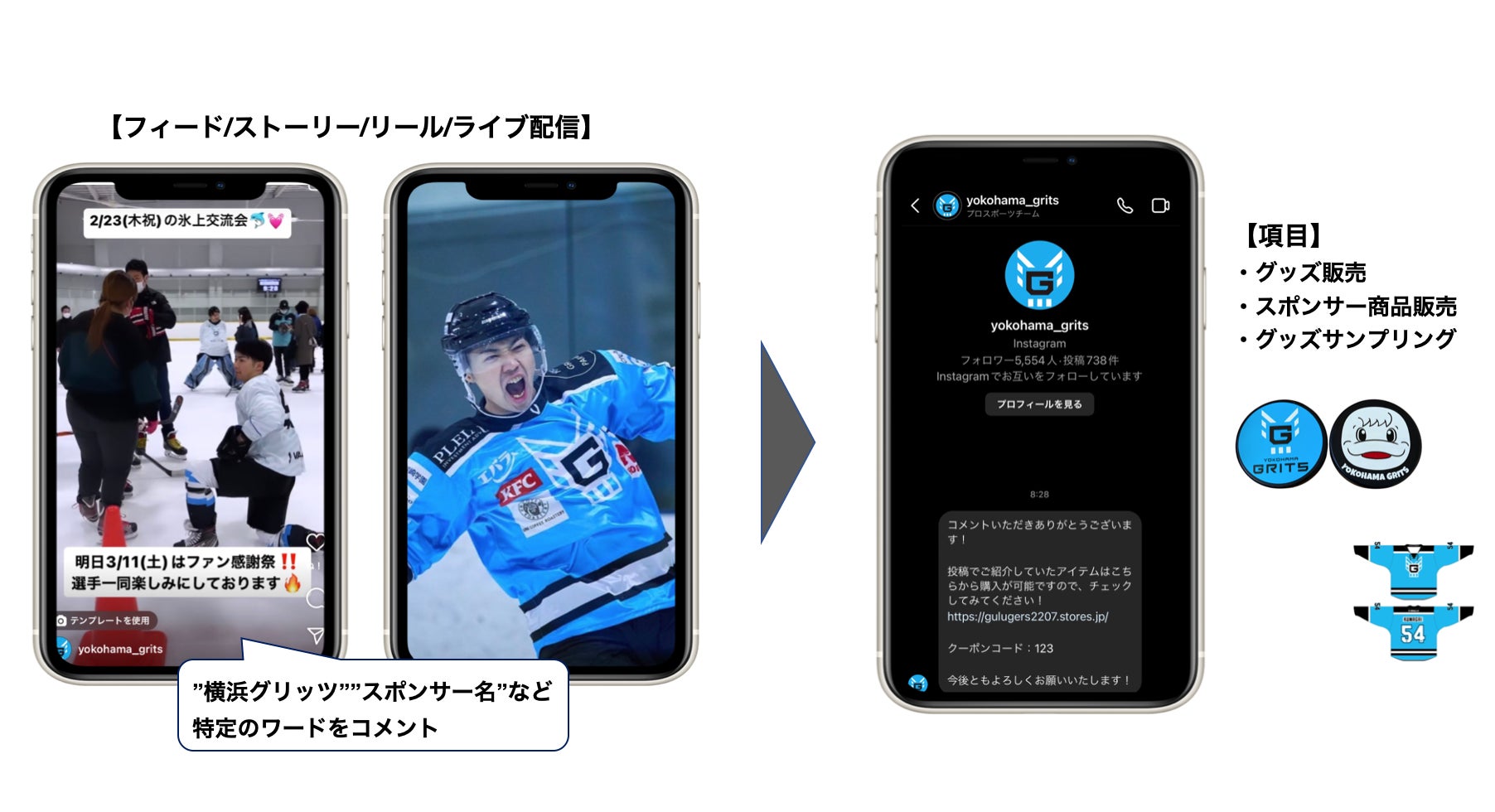 そこで、テイラーアップは、アイスホッケーチーム 横浜GRITS(https://www.instagram.com/yokohama_grits/?hl=ja)にライブコマースフォースを提供し、SNSアカウントを広告枠として活用する取り組みを開始いたします。
