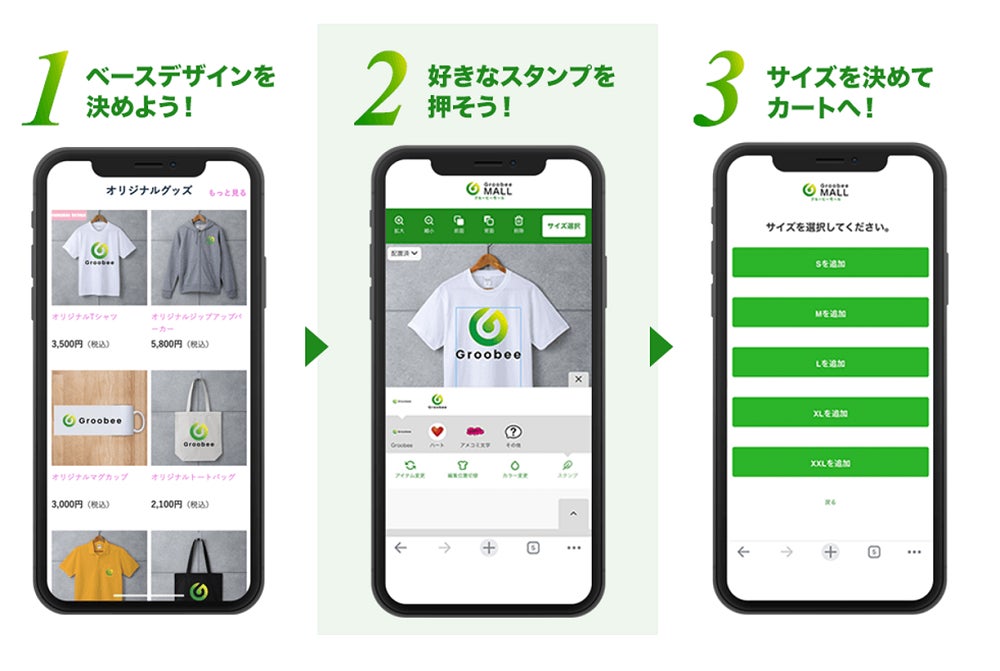 「Groobee(グルービー)」の機能として使用できるオンデマンドグッズ製造サービスです。ユーザーはTシャツやマグカップなど数百種類のベースの中から好きなアイテムを選択し、ECオーナーが用意したスタンプを自在に動かしてベースアイテムに配置することで、お好きなデザインのグッズ製造ができます。