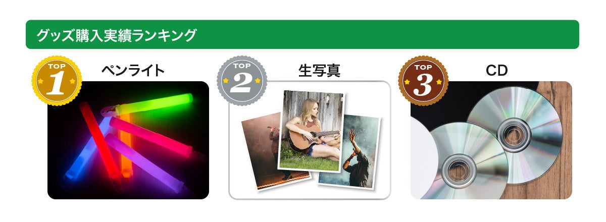 ECサイトで販売される人気の商品カテゴリとしては1位ペンライト、2位生写真、3位CDとなりました。会場で使用するライブグッズとしてペンライトの需要が高いことが伺えます。