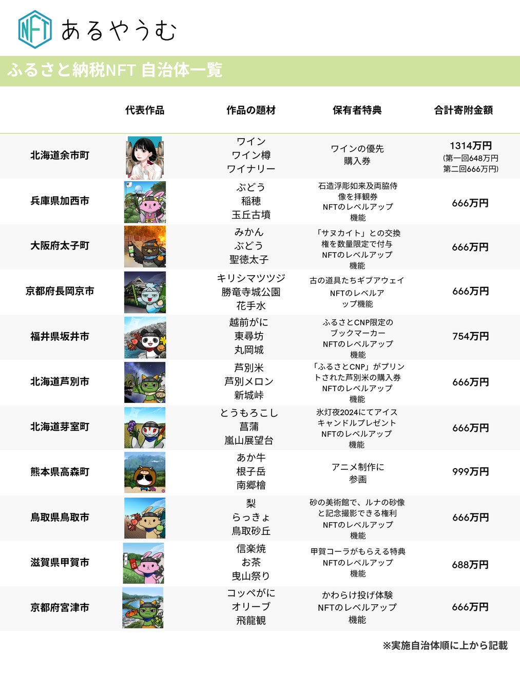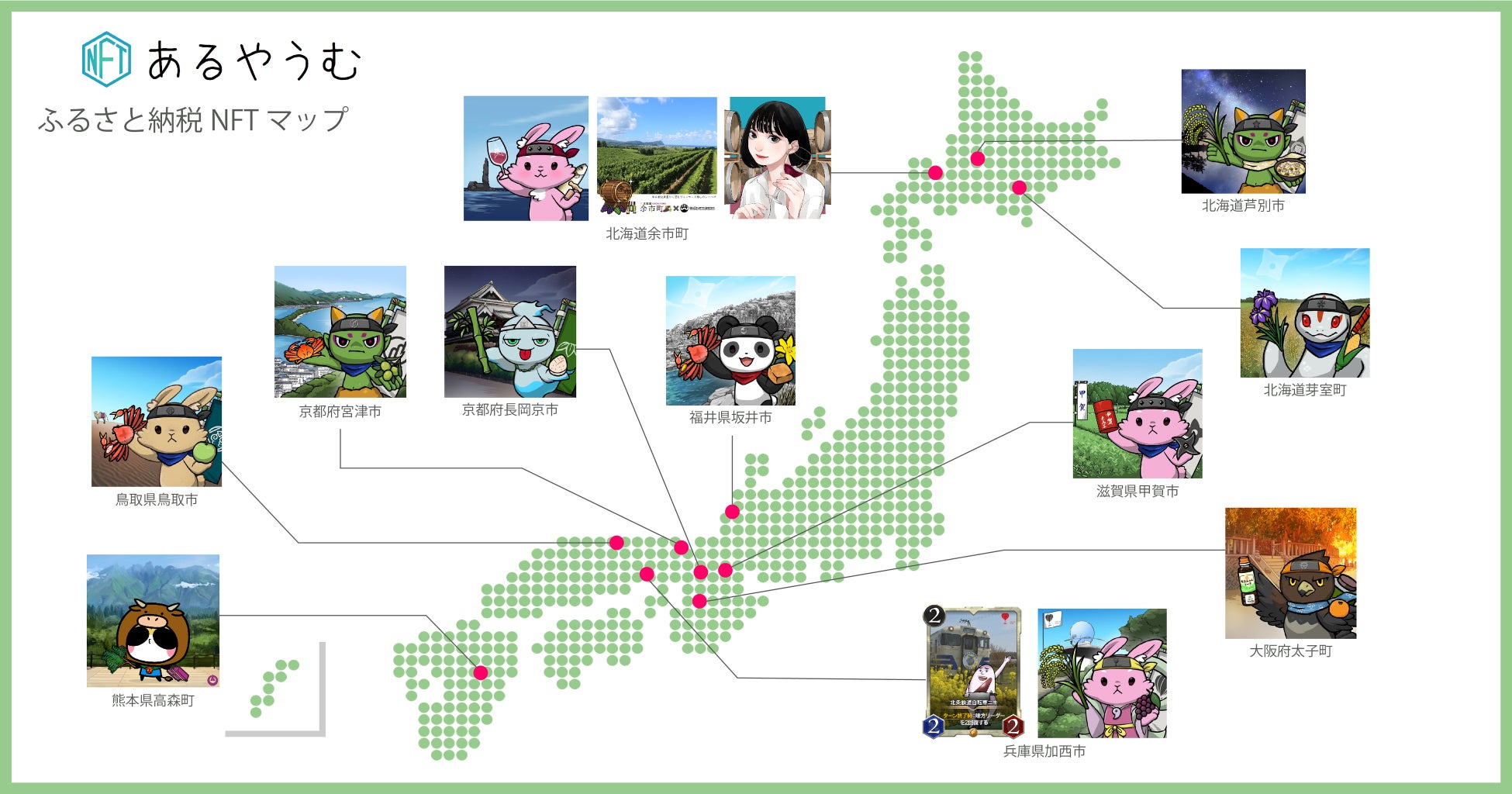 ふるさと納税NFTのパイオニア、株式会社あるやうむ(以下、あるやうむ)が技術提供を行い、ふるさと納税の返礼品としてNFTを採用した自治体を紹介する『ふるさと納税NFTマップ』を公開します。(作成:2023年3月31日時点)これまでに同取り組みに参画いただいた自治体の数は「11」団体となります。なお、2023年度、ふるさと納税の返礼品にNFTを採用する自治体は50を越える見込みとなっています。