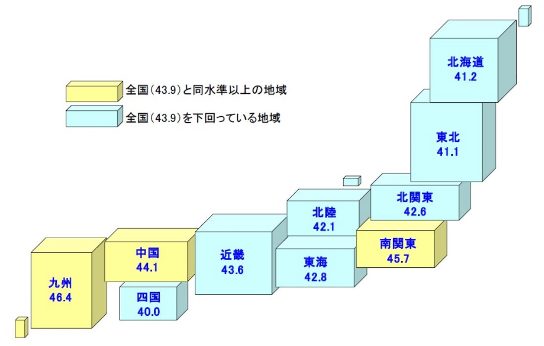 『九州』(46.4)…同1.6ポイント増。2カ月連続で改善。域内8県のうち全国唯一50台に達した「大分」など6県が改善、「佐賀」など2県が悪化した。国内外の旅行客の回復や大規模工場の建設などがプラスに作用し、域内半数以上の県で景況感の全国上位を占めた。
