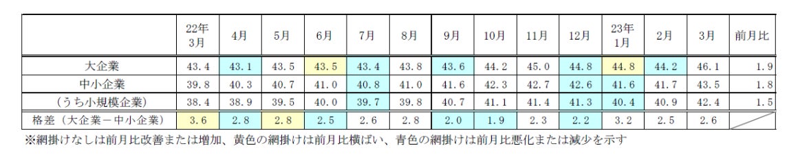 「大企業」(46.1)…前月比1.9ポイント増。4カ月ぶりに改善。人出の回復にともない、旅館・ホテルや飲食店、アパレル小売などで大きく改善した。加えて、DXに向けたシステム開発などのIT投資は堅調に推移し、「情報サービス」の景況感は60超となった。