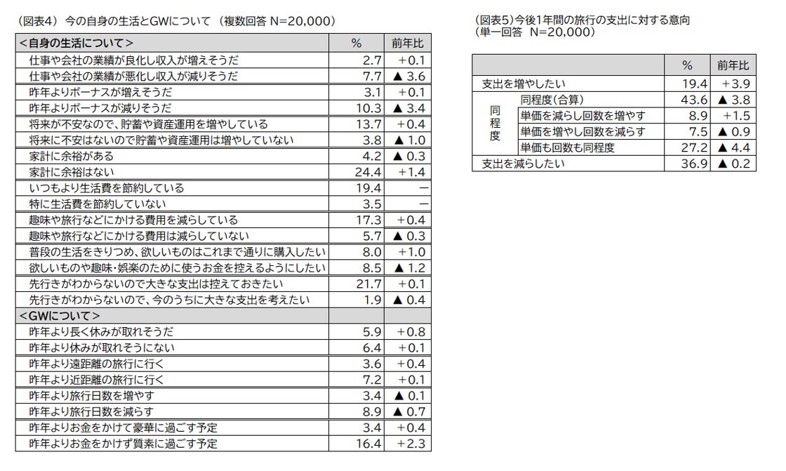 JTBが実施したアンケートで、生活とGWの旅行について当てはまる状況を聞いたところ、「仕事や会社の業績が悪化し収入が減りそうだ(7.7%)」は「収入が増えそうだ(2.7%)」より多いですが、前年より3.6ポイント下がっています。しかしながら「家計に余裕はない(24.4%)」が前年より1.4ポイント増加し、「家計に余裕がある(4.2%)」は0.3ポイント下がりました。また「将来が不安なので、貯蓄や資産運用を増やしている(13.7%)」も前年より0.4ポイント増加し、足元で多少の改善はみられるものの、昨年から家計に余裕のない状況が続いていると考えられます。
