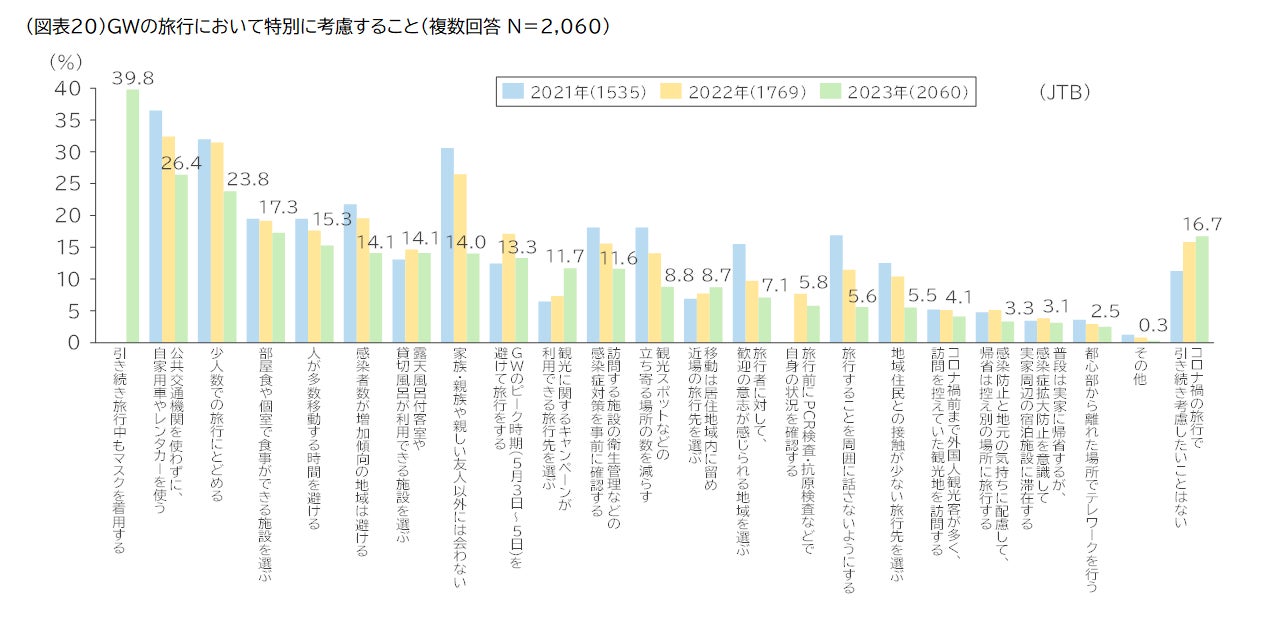 特に考慮することとして、「引き続き旅行中もマスクを着用する」が39.8%で最も多く、次いで「公共交通機関を使わずに、自家用車やレンタカーを使う(26.4%)」、「少人数での旅行にとどめる(23.8%)」、「部屋食や個室で食事ができる施設を選ぶ(17.3%)」「人が多数移動する時間を避ける(15.3%)」となりました。ほとんどの項目が前年に比べ減少する中、「観光に関するキャンペーンが利用できる旅行先を選ぶ(11.7%)」は前年より4.4ポイントの増加、「旅行者に対して、歓迎の意思が感じられる地域を選ぶ(8.7%)」は同1.0ポイントの増加となりました。引き続き新型コロナへの対策は取りつつも、キャンペーンなどへの期待も伺えます(図表20)。