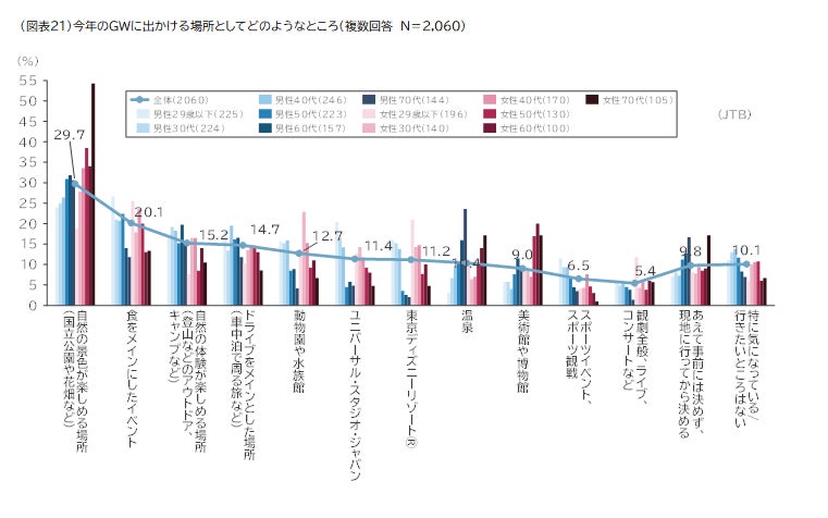 最後に、GWに出かける場所として気になっているところを聞きました。その結果、最も多かった答えは、「自然の景色が楽しめる場所(国立公園や花畑など)(29.7%)」、次いで「食をメインにしたイベント(20.1%)」「自然の体験が楽しめる場所(登山などのアウトドア、キャンプなど)(15.2%)」となりました。これまで自粛や中止を余儀なくされたイベントへの期待もみられます。選択肢が異なるため参考値となりますが、「特に気になっている/行きたいところはない(10.1%)」は前年の調査の18.3%から8.2ポイント減少しており、全体的に旅行意欲の高まりがうかがえます(図表21)。