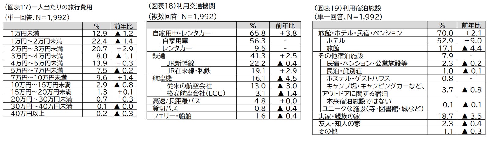 一人当たりの旅行費用:「1万円~2万円未満」が22.4%で最も多いものの、前年から1.4ポイント減少しました。続く「2万円~3万円未満(20.7%)」は前年より2.9ポイント増加、「1万円未満(12.9%)」は1.2ポイント減少しました(図表17)。