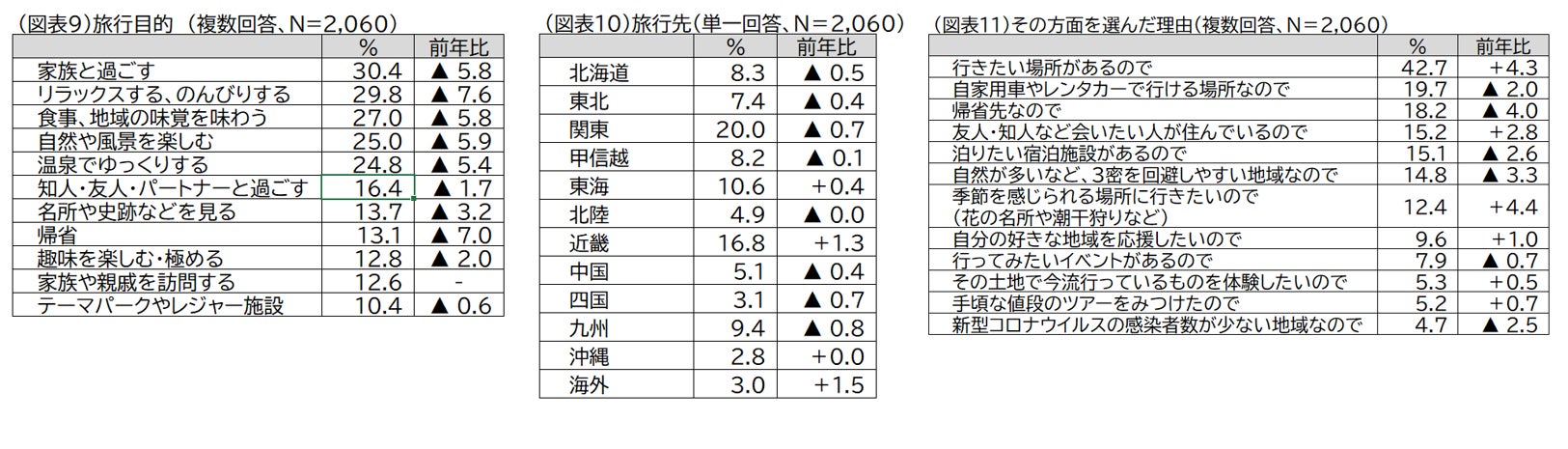 旅行先(国内):「関東」が20.0%で最多となり、次いで「近畿(16.8%)」「東海(10.6%)」「九州(9.4%)」となっています。また「海外」と答えた人も3.0%いました(図表10)。その旅行先を選んだ理由としては、「行きたい場所があるので(42.7%)」が最も多く、前年に比べ4.3ポイント増加しました。一方で、「自家用車やレンタカーで行ける場所なので(19.7%)」は2.0ポイント減少、「帰省先なので(18.2%)」は前年より4.0ポイント減少、「自然が多いなど、三密を回避しやすい地域なので(14.8%)」は3.3ポイント減少しました。感染症対策を優先する割合は昨年に続き低下傾向にあるものの、一定数の人は重視していると考えられます(図表11)。居住地別に旅行先を見ると、旅行先と居住地が同じ地方である域内旅行の割合は、「北海道(68.9%)」「九州(62.9%)」の2地域では60%を超える一方で、「関東」は29.5%となりました (図表12)。また前年と比較すると、近畿地方以外のすべての地域で域内旅行の割合は減少しており、居住地域外への旅行が増えています(図表13)。コロナ禍中は感染症対策として居住地域内の旅行先が選ばれていましたが、今年は居住地域外を目的地とする人が増える傾向にあります。