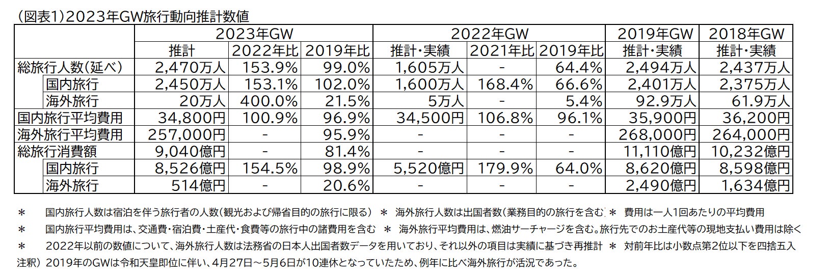 GW期間(2023年4月25日~5月5日)の旅行動向については、各種経済指標、交通機関各社の動き、宿泊施設の予約状況、各種定点意識調査などをもとに算出し、総旅行者数は2,470万人、総旅行消費額は9,040億円と推計します。