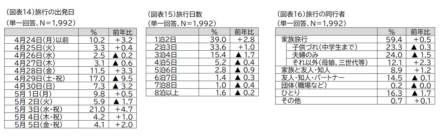 旅行の出発日:5連休の初日である「5月3日(水・祝)(21.0%)」が最も多くなっています。次いで「4月29日(土・祝)(17.0%)」「4月28日(金)(11.5%)」の順となっており、5月1日(月)、2日(火)を休んで長い連続休暇とする人もいることが考えられます(図表14)。
