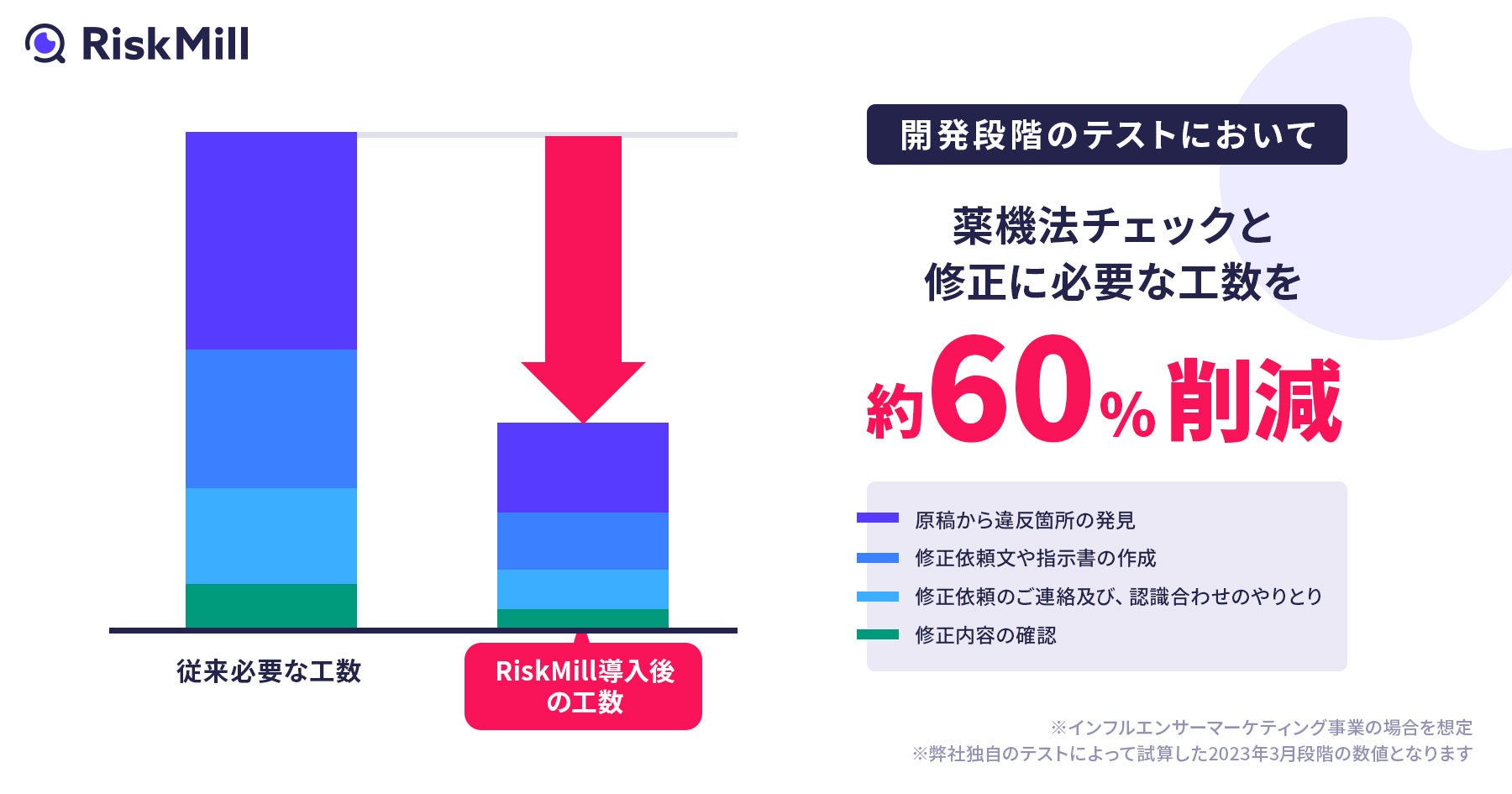 「RiskMill 薬機法チェックツール」の開発において、サイバー・バズ様に導入を見据えたパートナーとして様々なご協力を頂いております。同社が運営するモニターサイト「Ripre」の実際のデーを用いいた「RiskMil 薬機法チェックツール」の実用性試験においては、本ツール導入後、薬機法違反表現のチェックと修正に必要なコストを約60%削減(※弊社独自のテストによる2023年3月段階の数値)することが見込めるという結果が得られており、4月初旬に同サービスの実際のチェックフローへの試験的導入の開始を予定しております。