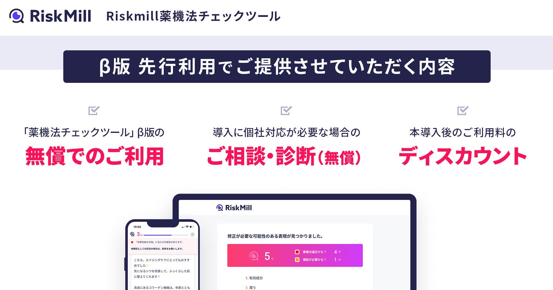 株式会社Crew(代表取締役:柳澤龍一、本社:東京都渋谷区)は、2023年4月6日(水)より、AIを活用し、薬機法チェックをいまよりも早く、簡単に行える「RiskMill(リスクミル)薬機法チェックツール」のβ版(無料)先行利用の募集を開始いたします。