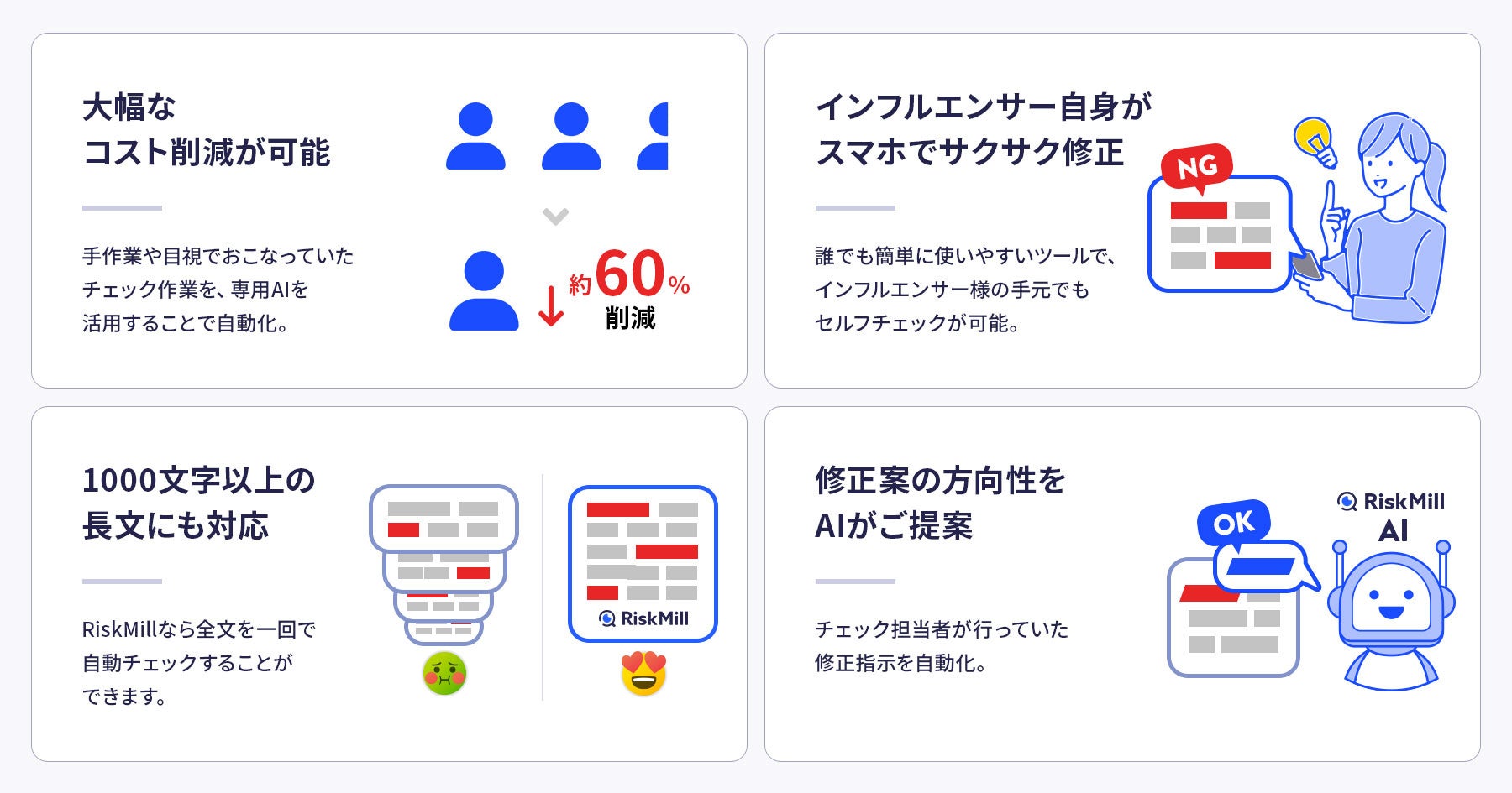 「RiskMill 薬機法チェックツール」は、化粧品や健康食品に関する広告表現において、薬機法をはじめとした違反表現の発見・修正をAIがサポートすることで、日々の業務遂行における大量のクリエイティブの校正にかかるコストを大幅に削減することを実現するWEBツールです。