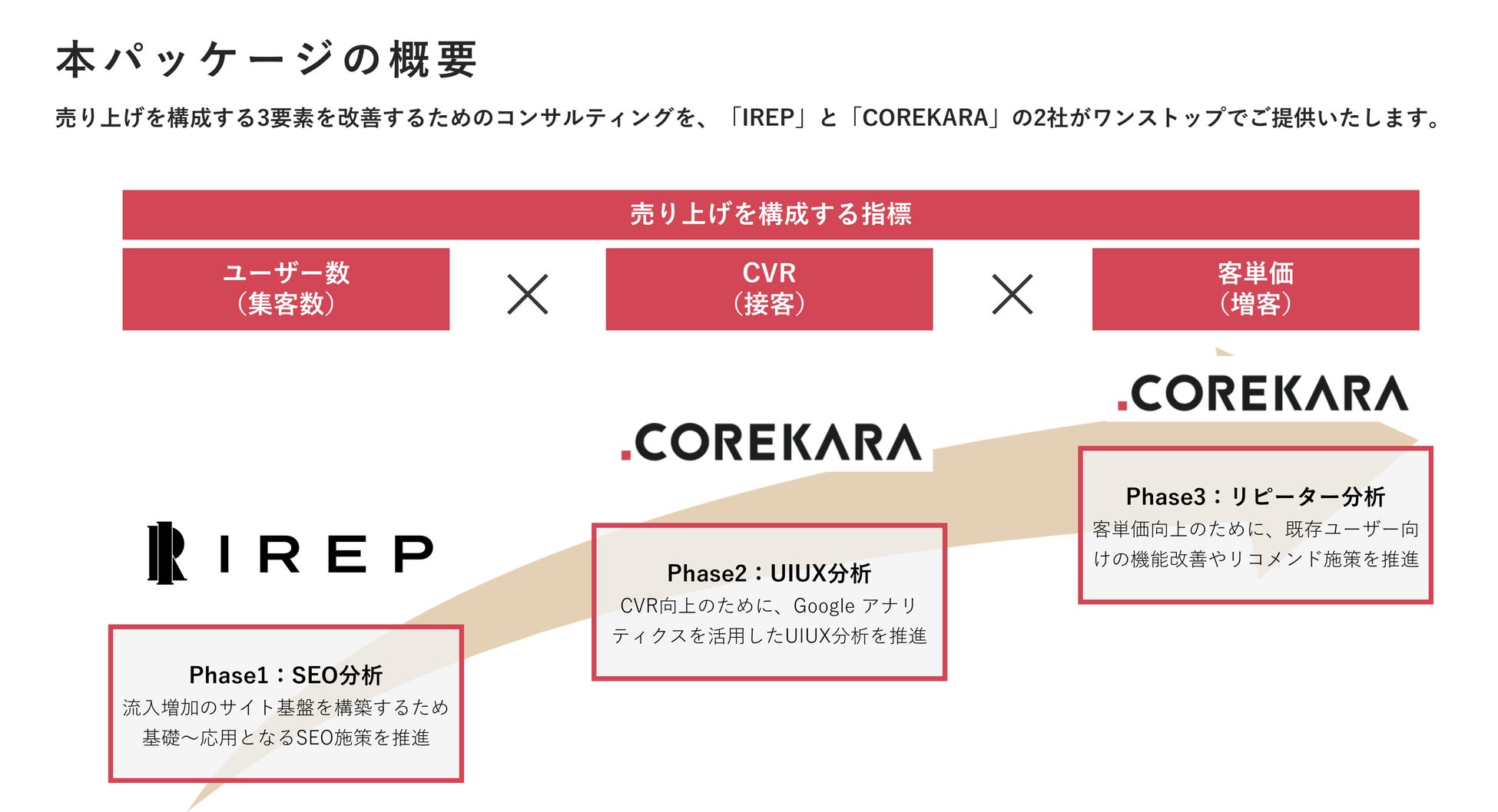 株式会社アイレップ(本社:東京都渋谷区、代表取締役社長 CEO:小坂洋人、以下アイレップ)と株式会社これから(本社:東京都新宿区、代表取締役:今泉雄介、以下COREKARA)は、2023年4月20日(木)よりECサイトの収益最大化に特化したコンサルティングサービスの提供を開始いたします。