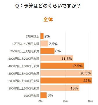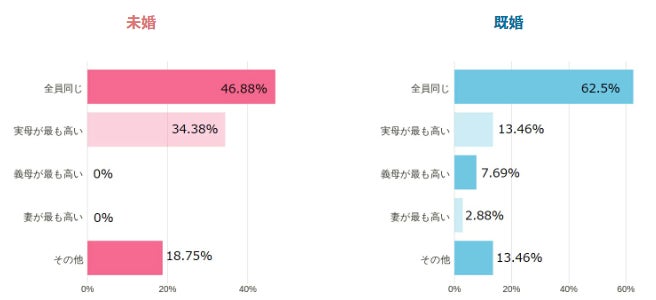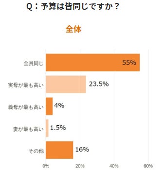 お相手別の予算としては、“全員同じ”との回答が全体では半数以上、既婚の方では6割以上がそのように回答しました。ただし、既婚の方でも13%は実母が最も高い、7%は義母が最も高いということで、実母・義母で差を付けているという割合が2割に上っています。
