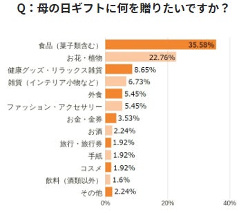 贈りたいものトップとしては、食品で、続いてお花・植物と定番品が上位にランクインしました。