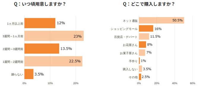 購入場所としては、ネット通販が約半数ということで最も高い割合に。続いてショッピングモールや百貨店・デパートと続き、お花屋さんやお菓子屋さんなどの専門店は低い割合となりました。
