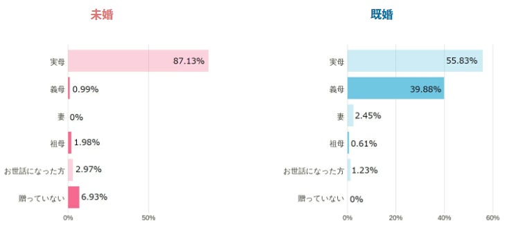 誰に贈るか、については、当然と言えますが、既婚未婚で数値が大きく異なりました。既婚ですと“義母”も“お母さん”に当たりますので、全体で見た時に義母へが25%だったのに対し、既婚の方のみで見てみると義母へが4割近くに上りました。