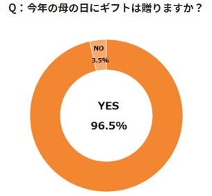そもそも、母の日にギフトを贈る予定の人はどのくらいいるのか、質問してみたところ、96%もの人が贈ると回答しました。日頃なかなか伝えられない感謝の気持ちを、やはりこういった機会に形にして伝えるという人が多いと考えられます。