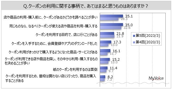 マイボイスコム株式会社(東京都千代田区、代表取締役社長:高井和久)は、5回目となる『クーポンの利用』に関するインターネット調査を2023年3月1日~5日に実施しました。調査結果をお知らせします。