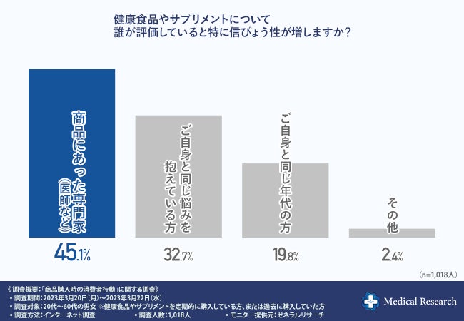 「健康食品やサプリメントについて誰が評価していると特に信ぴょう性が増しますか?」と質問したところ、『商品にあった専門家(医師など)(45.1%)』と回答した方が多く、次いで『ご自身と同じ悩みを抱えている方(32.7%)』『ご自身と同じ年代の方(19.8%)』と続きました。