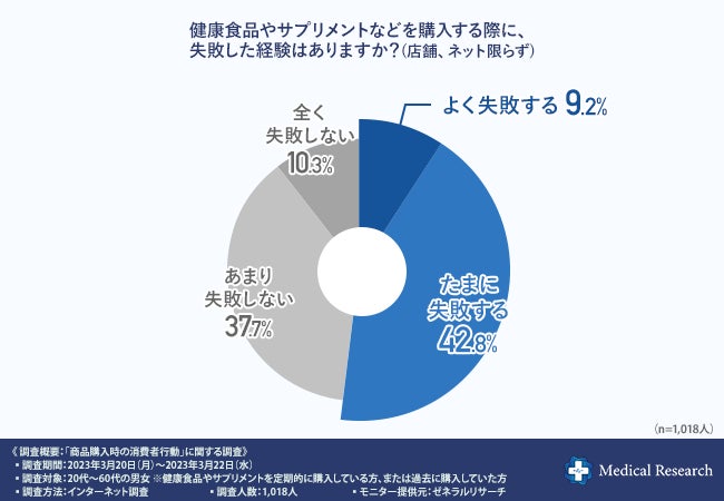 「健康食品やサプリメントなどを購入する際に、失敗した経験はありますか?(店舗、ネット限らず)」と質問したところ、『よく失敗する(9.2%)』『たまに失敗する(42.8%)』『あまり失敗しない(37.7%)』『全く失敗しない(10.3%)』という回答結果になりました。