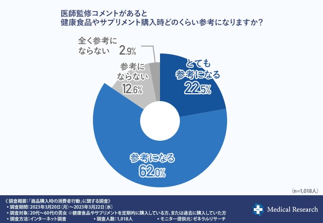 そこで、「医師監修コメントがあると健康食品やサプリメント購入時どのくらい参考になりますか?」と質問したところ、8割以上の方が『とても参考になる(22.5%)』『参考になる(62.0%)』と回答しました。