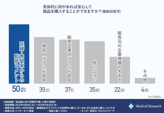 そこで、「具体的に何があれば安心して商品を購入することができますか?(複数回答可)」と質問したところ、『医師・専門家からの監修コメント(50.0%)』と回答した方が多く、次いで『商品のブランド認知(39.3%)』『販売企業のブランド認知(37.1%)』と続きました。