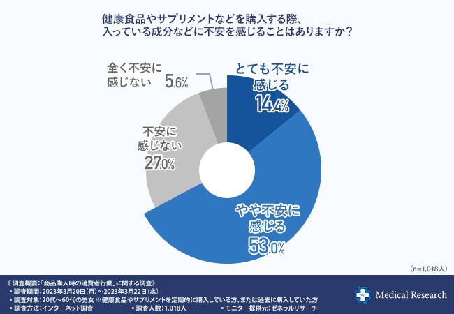 「健康食品やサプリメントなどを購入する際、入っている成分などに不安を感じることはありますか?」と質問したところ、6割以上の方が『とても不安に感じる(14.4%)』『やや不安に感じる(53.0%)』と回答しました。