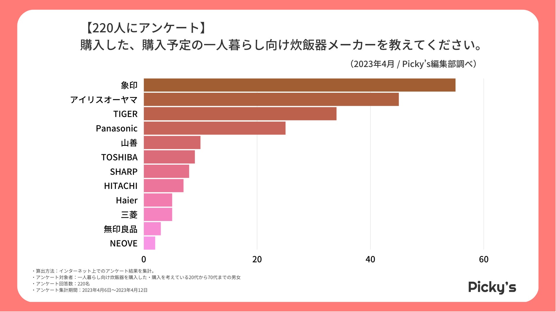 「Picky’s」は、インターネットショッピングにおいて、購入前に試せない・選ぶべきものがわからないという課題の解決を目標に、あらゆる商品のおすすめランキングや検証レビューを紹介するサイトです。このたびPicky’s(https://rentry.jp/note/)では、春の新生活に先駆けて、一人暮らし向け炊飯器についてインターネット上でアンケート調査を行いましたので発表いたします。