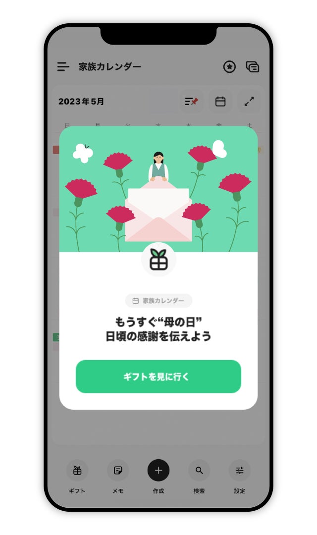 - 対象ユーザー ギフトはカレンダーを共有している方へ贈れます/キャンペーンへのご参加はお一人様1回限りとさせていただきます/キャンペーンのさらに詳しい内容はアプリのギフトページ(https://timetreeapp.com/gift)よりご確認ください