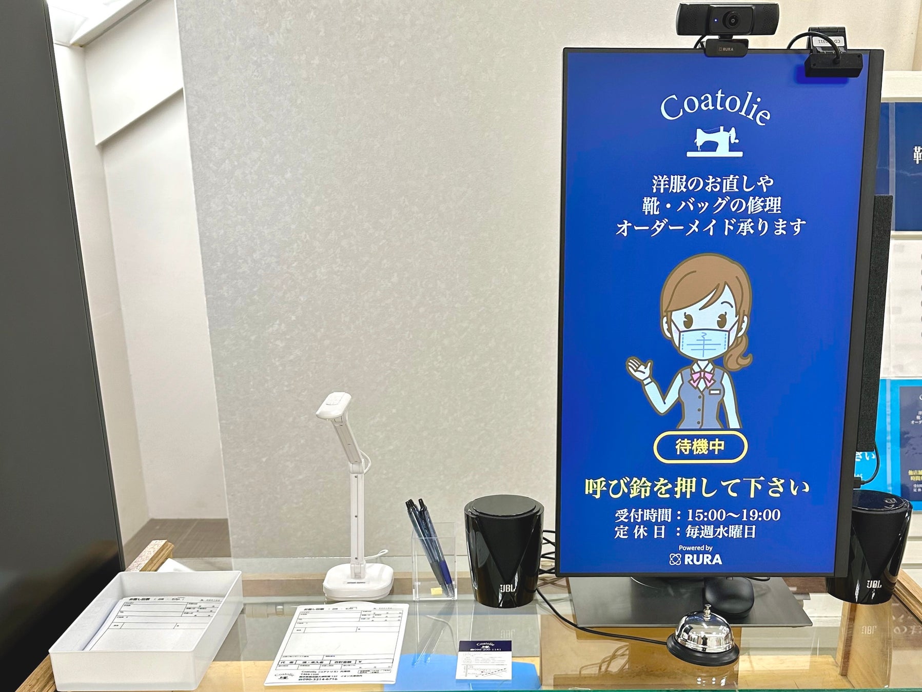 10:00~15:00や10:00~17:00はスタッフが店頭にて縫製作業や受付を行なっていますが、それ以外の時間はRURAを用いて遠隔地から受付をすることで、店頭の無人化を実施しています。