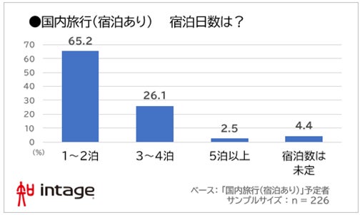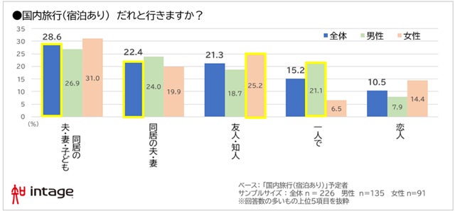 「国内旅行」者の予定宿泊数は、「1~2泊」が7割弱と短め。一緒に旅行する相手は、「家族」が最も多い。女性は「友人・知人(25%)」、男性は「1人で(21%)」が目立つ。