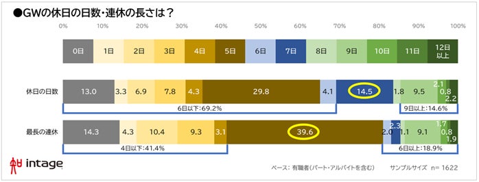GW期間中「休める日数のトータル」については、カレンダー通りの「7日」は15%に留まり、回答者の7割は「6日以下」と回答。その一方で「9日以上」の長期の休みを取得予定の方も15%ほど存在していました。GW期間中の「最も長い連休日数」については、カレンダー通りの「5連休」が4割と最も多くなっています。また、平日の休みを加えて6連休以上の休暇を取得する人も2割弱存在しており、6割程度が5日以上の連休を取得できる予定となっています(図表3)。
