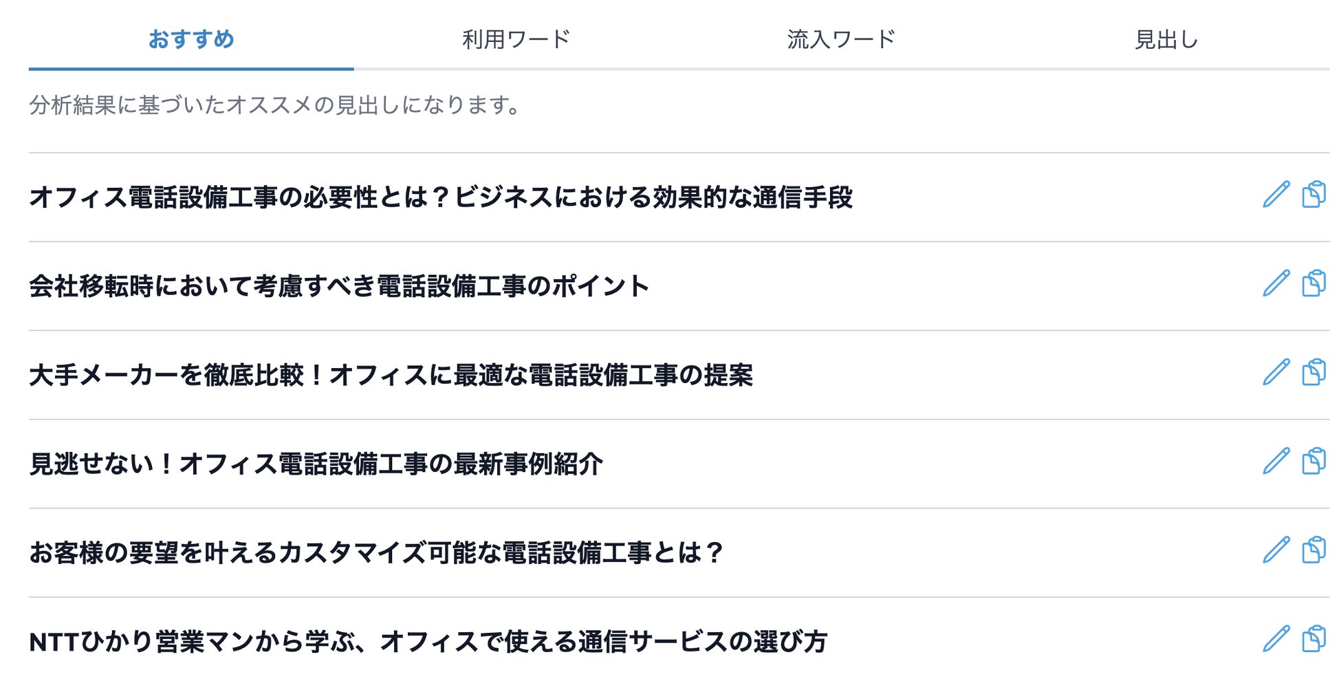 分析が完了すると、SEOに最適な見出しがTranscopeより提案されます。