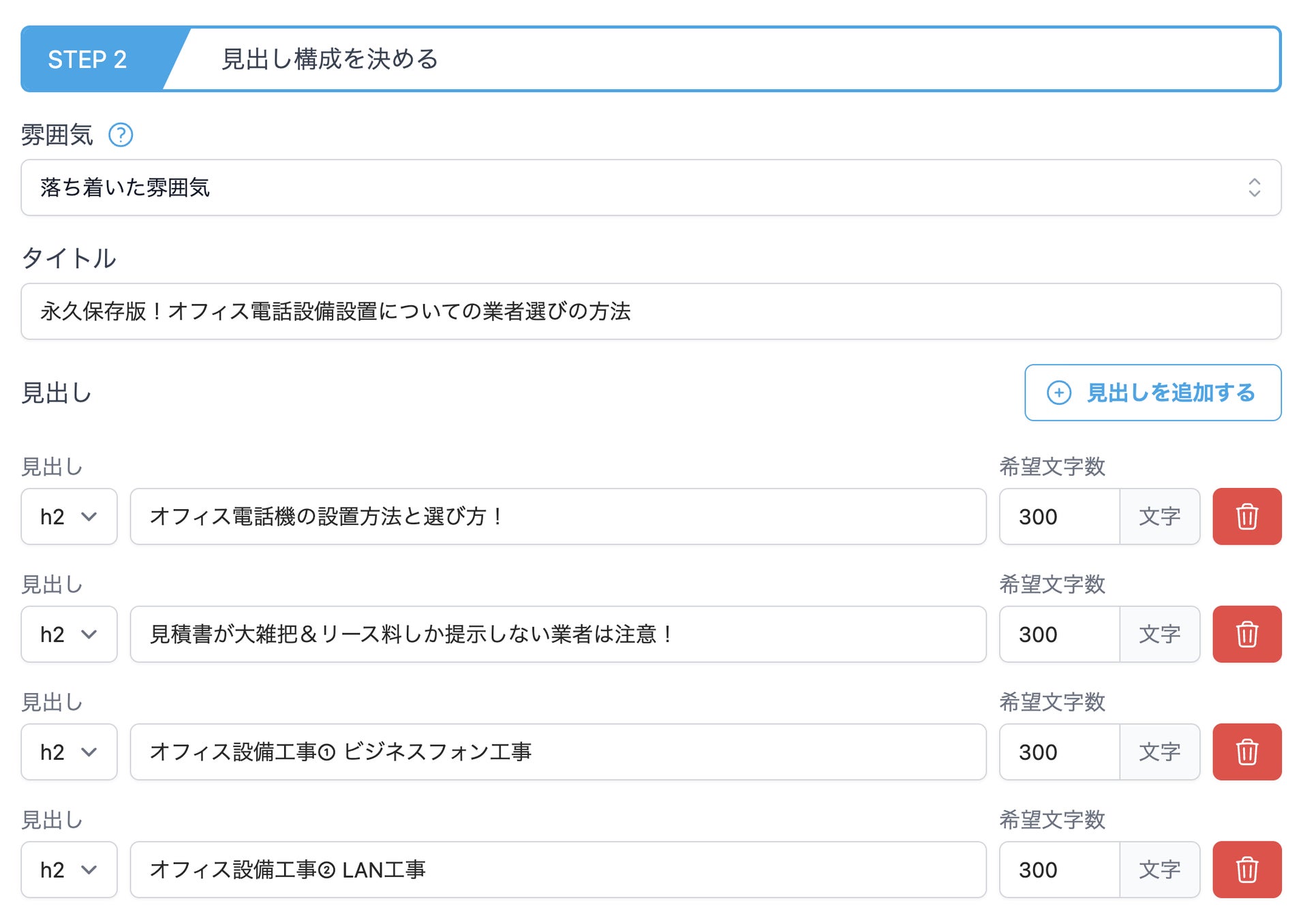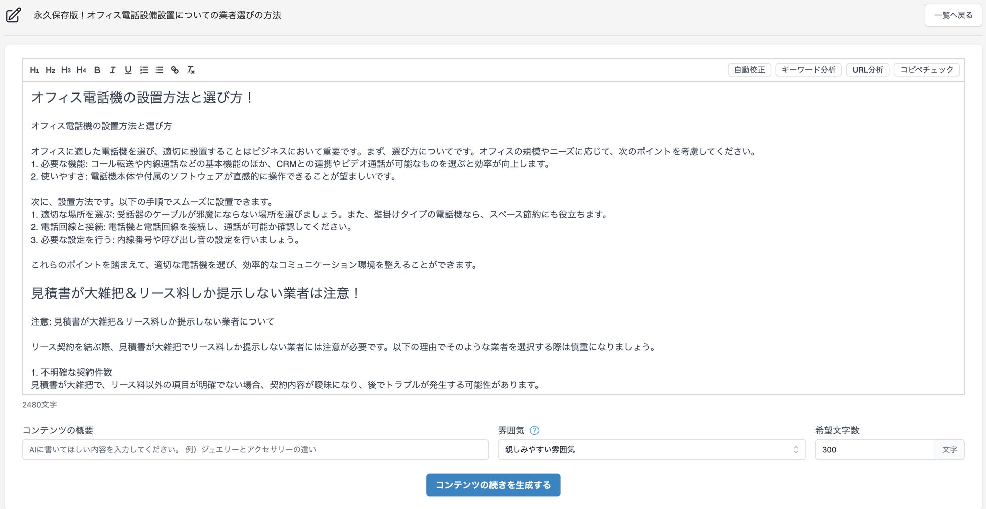 提案された見出しを選択し、保存することで、GPT-4による文章の自動生成が開始されます。