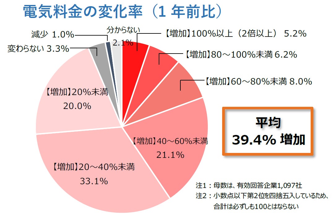 電気料金の総額が1年前と比べてどのように変化したかを尋ねたところ、「【増加】20~40%未満」とした企業が全体の33.1%で最も高かった。次いで「【増加】40~60%未満」(21.1%)、「【増加】20%未満」(20.0%)が続いた。【増加】した企業の合計は93.6%に達し、9割超の企業で1年前より電気料金の総額が増加した。他方、「変わらない」は3.3%、「減少」は1.0%だった。電気料金の総額は1年前より平均*1で39.4%増え、約1.4倍に増加した。
