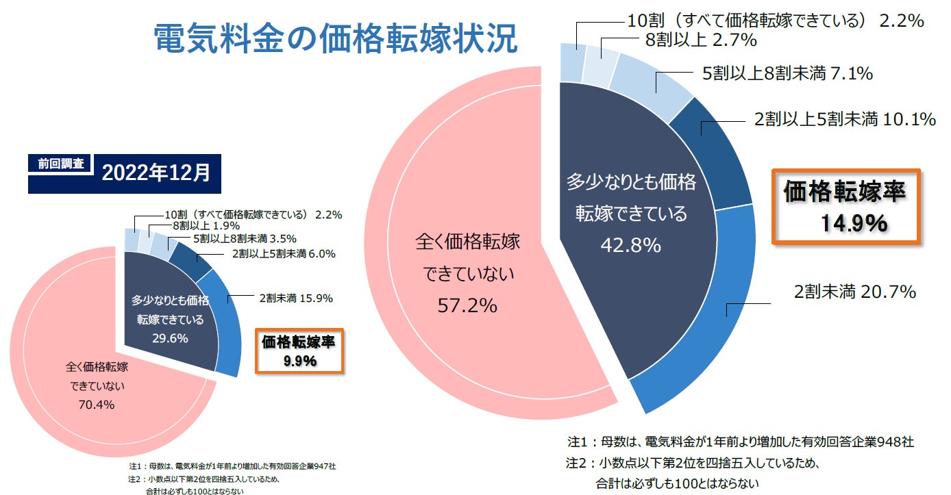 前回調査(2022年12月)と比べると、『多少なりとも価格転嫁できている』企業の割合は13.2ポイント増加(前回調査29.6%⇒今回調査42.8%)し、「価格転嫁率」も5.0ポイント上昇(同9.9%⇒同14.9%)した。